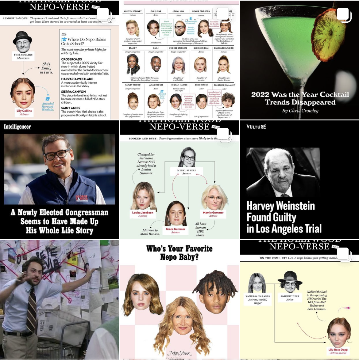 When I joined New York Magazine in 2021, the team was relying on screenshots for all six of its vertical accounts (NY Mag, The Cut, Grub Street, Vulture, Curbed and The Strategist). In cases where screenshots weren’t used, stock images were paired with lengthy captions to provide context. Blog posts, cover stories, feature articles, and columns lacked distinct visual treatments. My goal was to ensure that our audience could instantly recognize content across each feed with just a quick scroll.